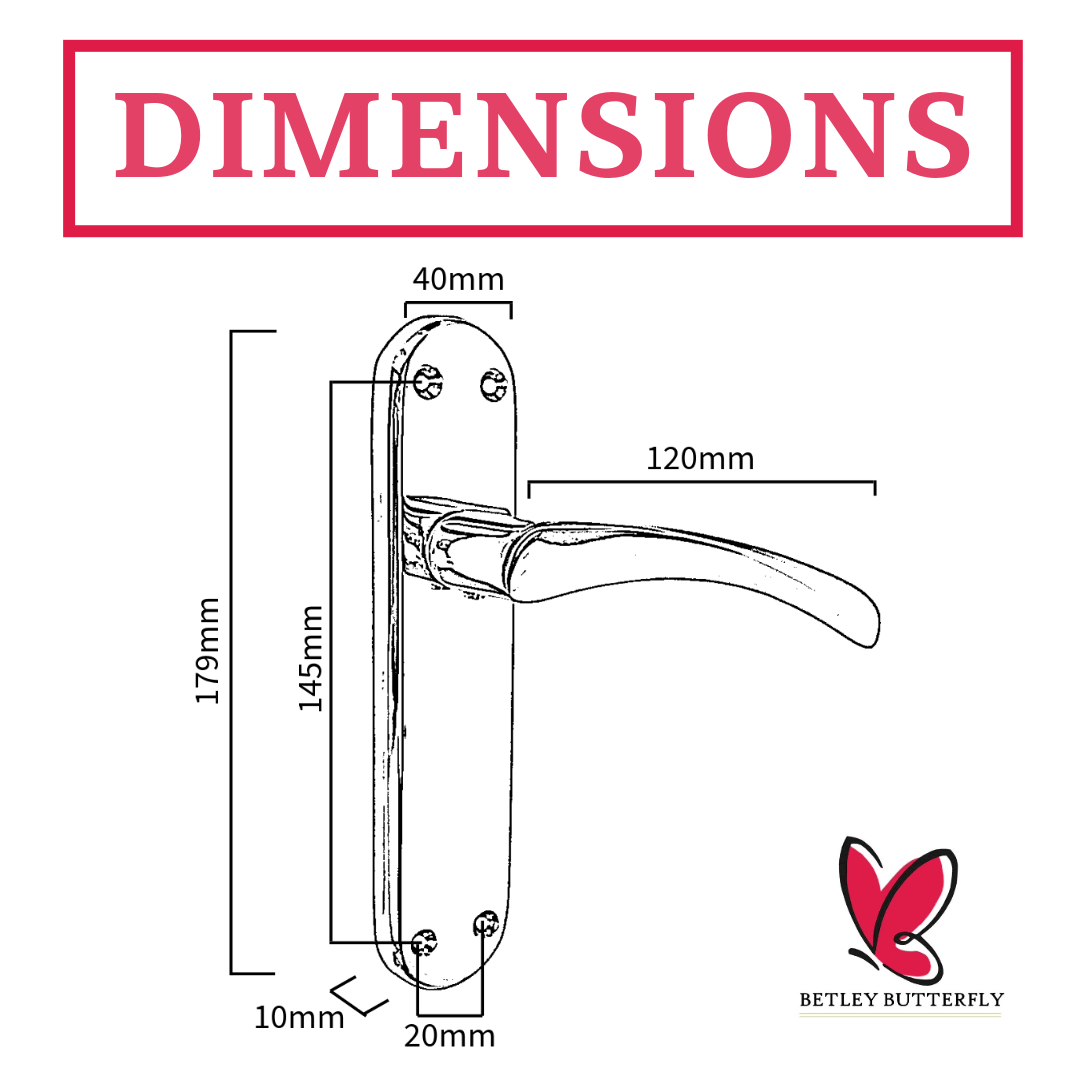 - Dimensions: Backplate 179mm x 40mm, 10mm projection, 120mm twisted lever length.